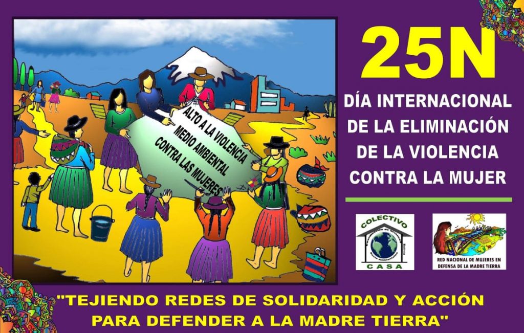 Desde el Colectivo CASA y la Red Nacional de Mujeres en Defensa de la Madre Tierra nos pronunciamos en este nuevo 25 de noviembre para la eliminación cualquier forma de violencia contra las mujeres. Entendemos también que son las mujeres jóvenes, pobres y de pueblos indígenas las que se encuentran expuestas a mayores márgenes de vulnerabilidad. Desde la defensa del Medio Ambiente y los Territorios, consideramos que los megaproyectos y otras formas de despojo están violentando no solamente la tierra, sino los cuerpos de millones de mujeres encargadas de la reproducción de la vida en contextos comunitarios. Por eso nos sumamos a la denuncia de la violencia medioambiental que denuncian las defensoras de la Madre Tierra y nos acuerpamos con las hermanas de todo el mundo en este esfuerzo para lucha contra el sistema de despojo capitalista y patriarcal.