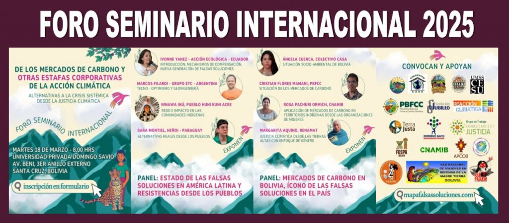 Durante la actividad se realizará un foro internacional abierto a todo público el martes 18 de marzo desde las 8 am. en la Universidad Domingo Savio, en el Foro Seminario “De los mercados de carbono y otras estafas corporativas de la acción climática” se abordará el proceso de la crisis climatica en Bolivia y se entregará una mirada regional de la resistencia a proyectos contaminantes o engañosos con voces y experiencias de Ecuador, Argentina y Paraguay. Constará de dos mesas llamadas “Estado de las falsas soluciones en América Latina y resistencias desde los pueblos” y “Mercados de carbono en Bolivia, ícono de las falsas soluciones en el país”.