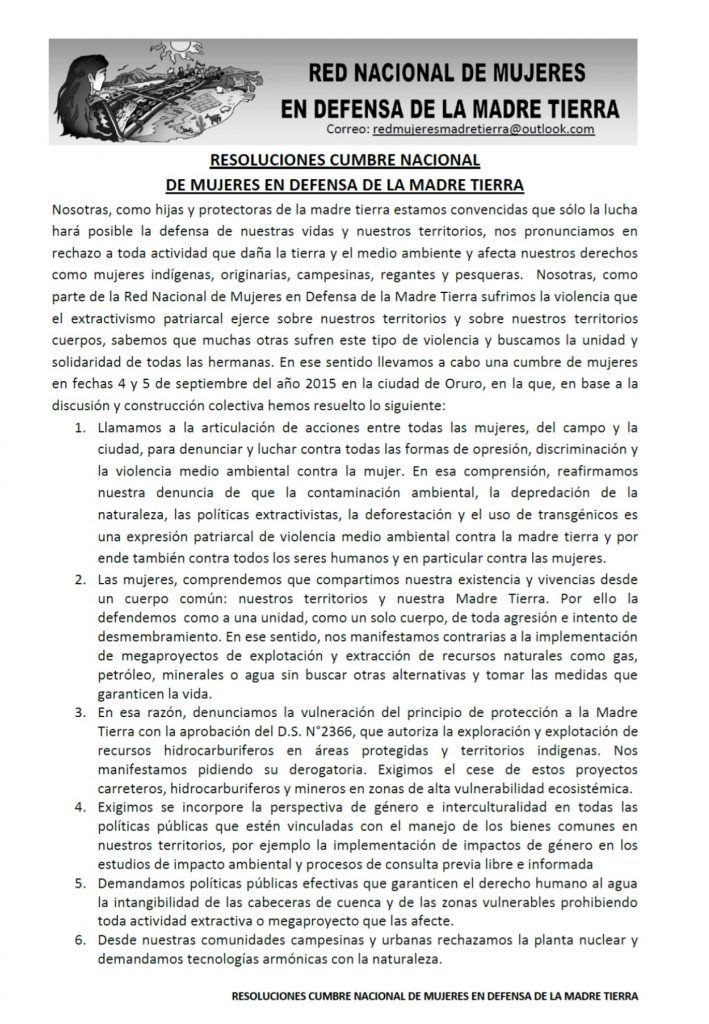 CONCLUCIONES CUMBRE DE MUJERES EN DEFENSA DE LA MADRE TIERRA