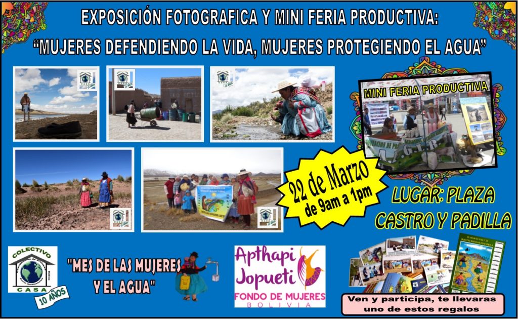 El evento se realizará este 22 de marzo en la Plaza Castro y Padilla de la ciudad de Oruro, a partir de las 9:00 am hasta las, se ofrecerán productos de comunidades que están resistiendo a la minería desde las voces de los territorios que producen la vida y desde las manos de las mujeres que se encargan de reproducirla, además se regalara postales con mensajes alusivos al mes del agua y la mujer, cartillas y calendarios.