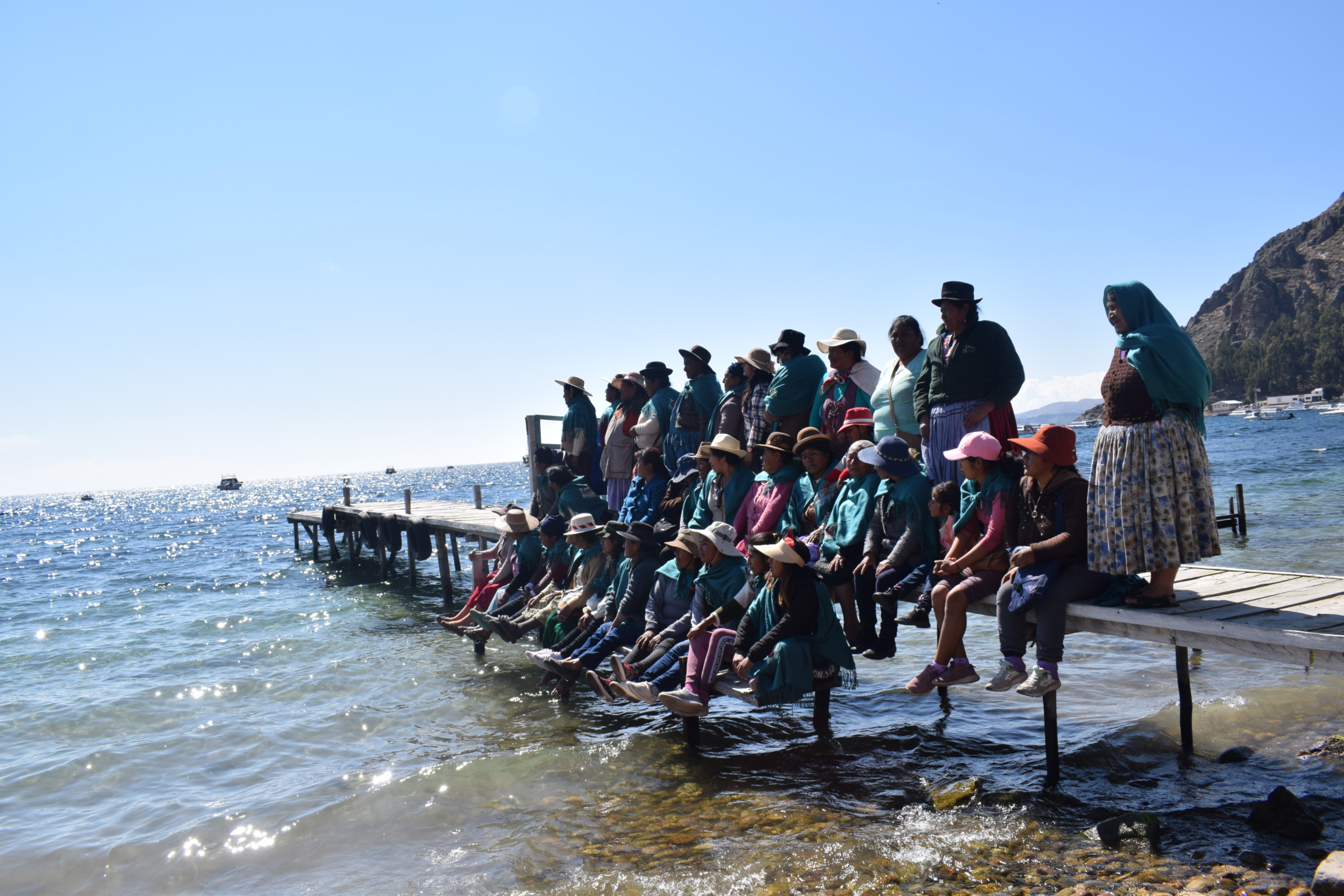 A orillas del majestuoso Lago Titicaca nos reunimos las Mujeres Defensoras de la RENAMAT para pedirle a nuestra Mama Yaku que regrese por su ruta hasta nuestro territorio a llenar el Lago Poopó que ahora está seco.