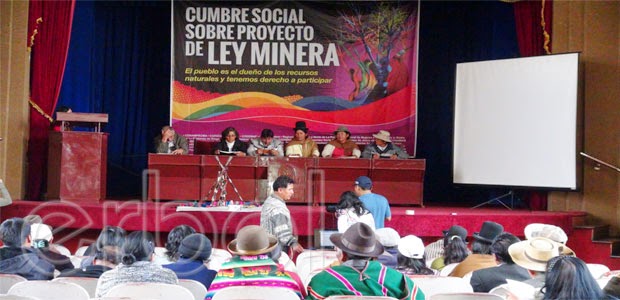 Organizaciones de distintos sectores tratan el proyecto de Ley de Minería en una Cumbre Social que se inauguró este jueves en la ciudad de La Paz, con la presencia mayoritaria de campesinos e indígenas, quienes mostraron su rechazo al borrador de la futura norma por falta de consenso.
