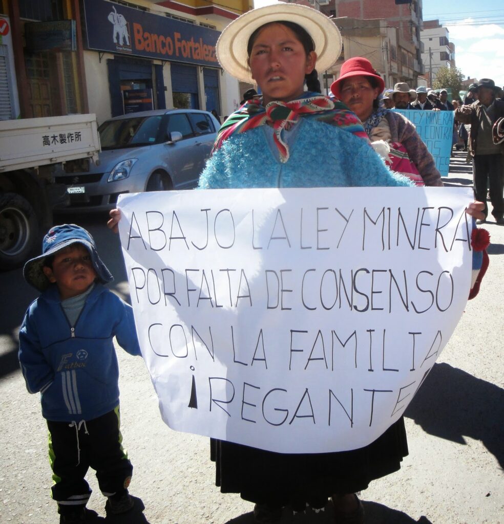 RED DE MUJERES EN DEFENSA DE LA MADRE TIERRA: Aunque la Constitución Política del Estado, dice que los recursos minerales son del pueblo boliviano, lo cierto es que la decisión sobre su gestión desde una legislación como la Ley Minera, es privilegio de unos pocos, justo los que se benefician directamente como los empresarios y los cooperativistas. El lunes 17 de marzo, se realizó un acto de entrega al presidente Evo Morales del proyecto “consensuado” entre actores mineros de la nueva Ley Minera, como se dice en términos populares “entre gatos se pusieron de acuerdo para comer la carne”. Este acto marca una actitud profundamente antidemocrática, pues se excluyó la participación de otros sectores sociales, de la sociedad civil en su conjunto y a la fecha el proyecto consensuado es un secreto que solo es de conocimiento de los operadores mineros.